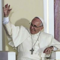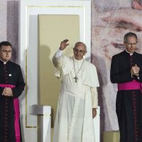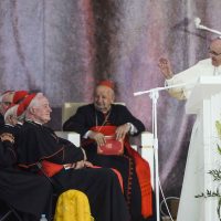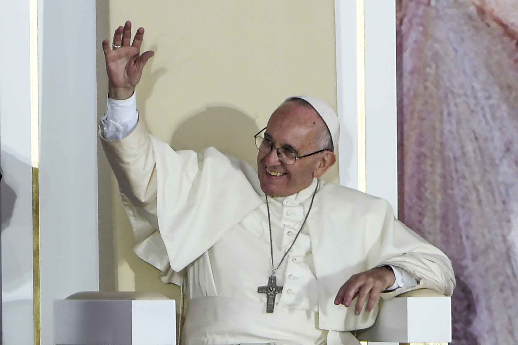 - Cracovia, 28 luglio 2016. Papa Francesco raggiunge il parco Blonia con un tram accompagnato da giovani disabili